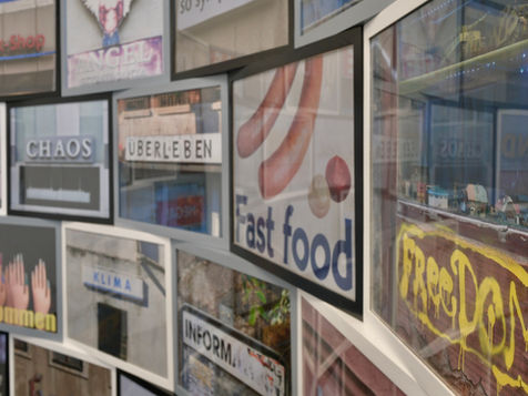 Schwall combines photography, installation and language. In an apparently arbitrary arrangement of 45 photographically fixed terms, the work invites to reflect on fragments of information.